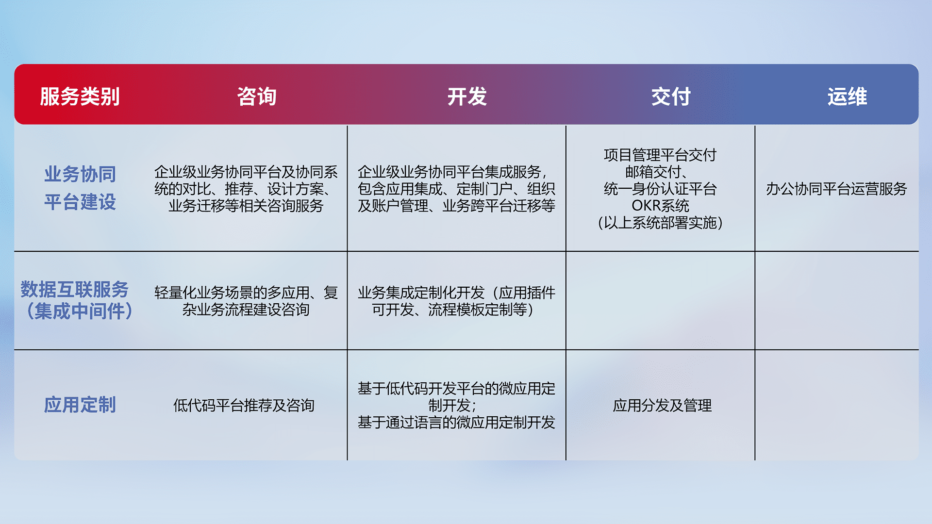 针对钉钉、、、、企微、、、、IDaas等平台级产品提供产品的规划、、方案、、交付、、、定制化开发等服务,,实现如统一协同办公、、智能客户服务、、混合会议管理、、智能数据查询、、、、等业务场景,,,,实现数字化转型。。。。