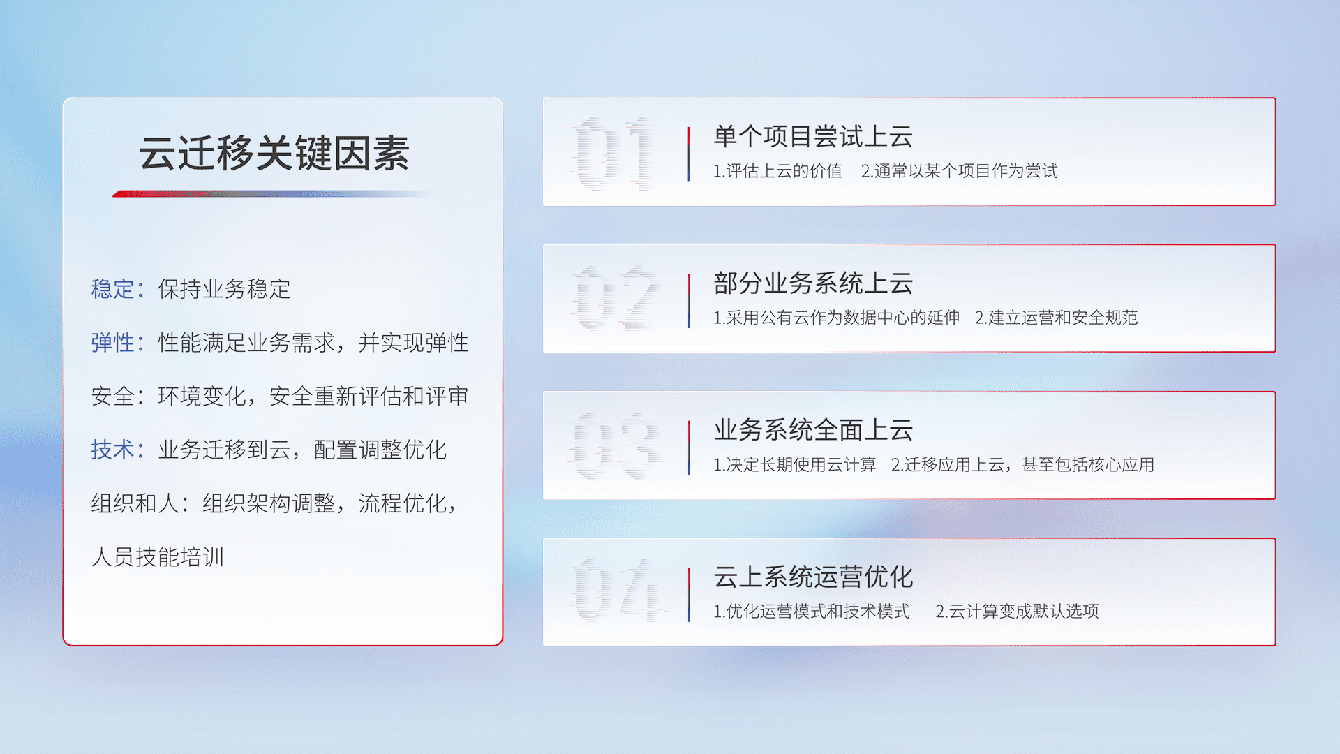 结合实际业务,,,从规划设计、、云平台选型、、、云原生改造、、、数据迁移、、、、集成交付,,,迁移全过程为客户识别最佳上云路径,,,做好风险识别管理,,设计网络架构、、、身份权限、、、安全审计合规、、、操作审计、、日志审计、、监控告警策略、、多站点容灾设计等,,,,对云上基础设施进行整体规划,,提升IT治理水平,,,以满足弹性、、、、高可用、、、高性能的需求。。。。