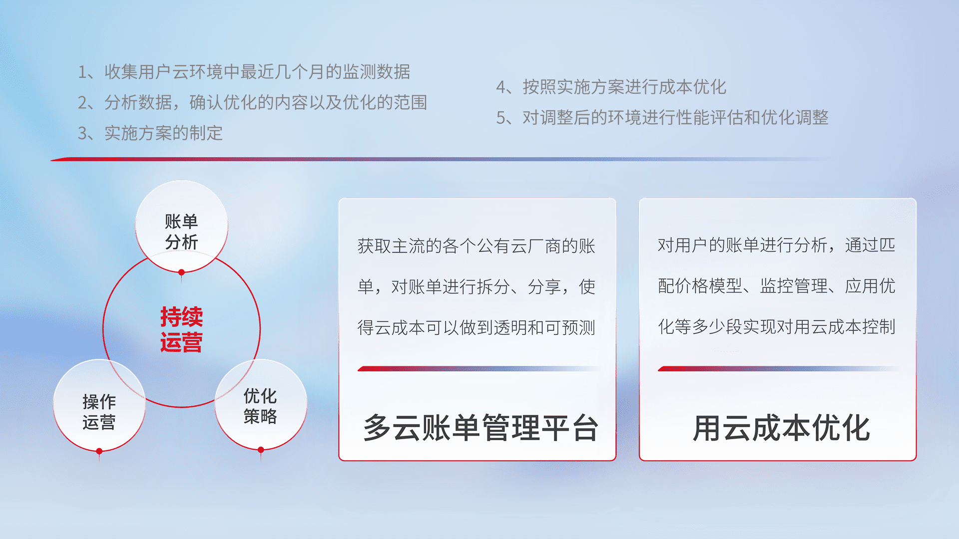 通过多云纳管,,,以统一的资源数据模型把客户的云资源进行抽象和封装,,,进而实现对多云资源的统一操作,,,保障云资源管理的可靠性、、、稳定性与可用性。。。。量身定制化运维内容,,配置、、、、开发运维、、、补丁管理、、、备份、、、、监控、、认证和访问管理、、、审计和日常巡检等,,,保障在用云过程中的可靠度,,稳定度以及高可用率。。
