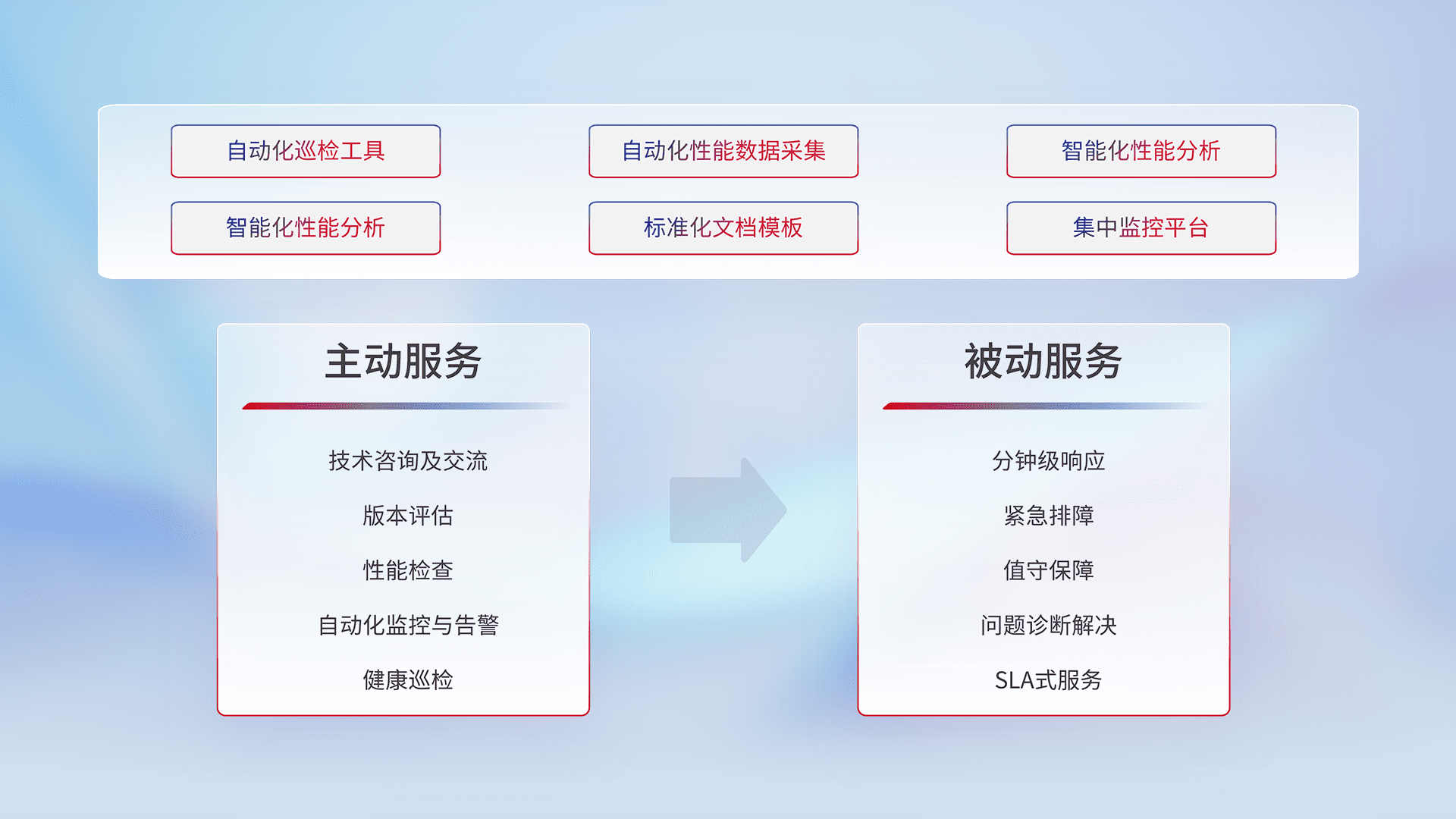 智能化工具和标准化文档,,保障服务质量,,,提供主动服务(包含技术咨询、、版本评估、、、性能检查、、自动化监控与告警、、、健康巡检)和被动服务包含(分钟级响应、、、紧急排障、、、值守保障、、问题诊断解决、、、、SLA服务)。。